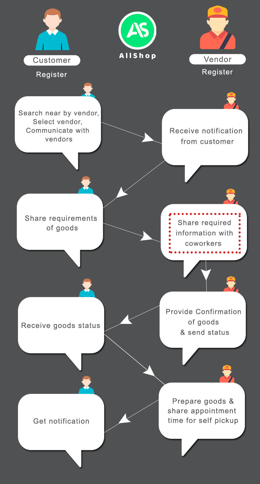AllShop is free for customers, too. Customers can search the local vendors near their location and communicate with them about their requirements and needs without visiting the shops. Customers can get information about products/services, pricing, and negotiate with local vendors with the app only. The customer does not require to share the contact details with the vendors. So, it preserves the privacy of the customers. Customers do not require to stand up in the long queues and save their precious time. Customers can confirm the orders/services on the application and get the self visit/pickup appointment time or home delivery time (if the vendor supports the home delivery).